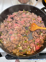 - Add the ground beef and cook until brown, breaking it into small chunks like picadillo.